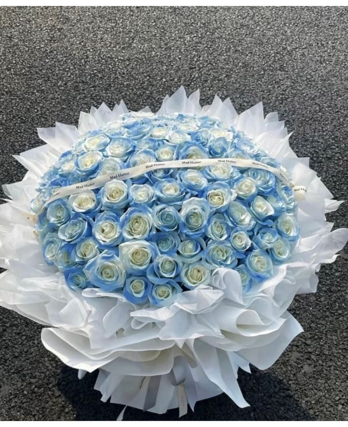 Presenting 101 pc  Blue, a stunning bouquet of 101 fresh blue roses, elegantly wrapped by hand in exquisite queen white paper. This expertly crafted arrangement combines vibrant blue hues with sophisticated wrapping, making it an ideal choice for expressing deep admiration or celebrating special occasions with refined style.