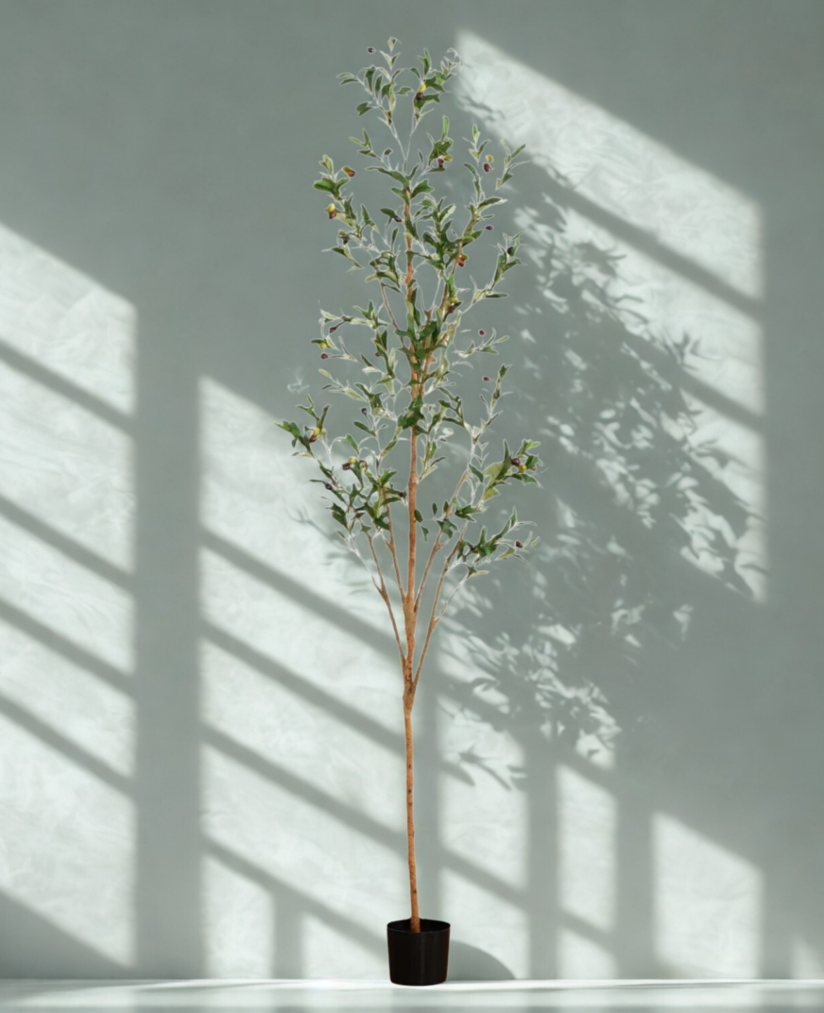 This 82" olive artificial tree is a most sought-after vertical home decor piece, with elegant brown stalks and tender bright green leaves. Its stylish yet country feel elicits admiration on social media. The tree looks realistic with plastic olives, such as walking through Italian vineyards. It is quite adaptable to a natural basket or planter that will complement your existing interior, so it is a convenient item to place in any room