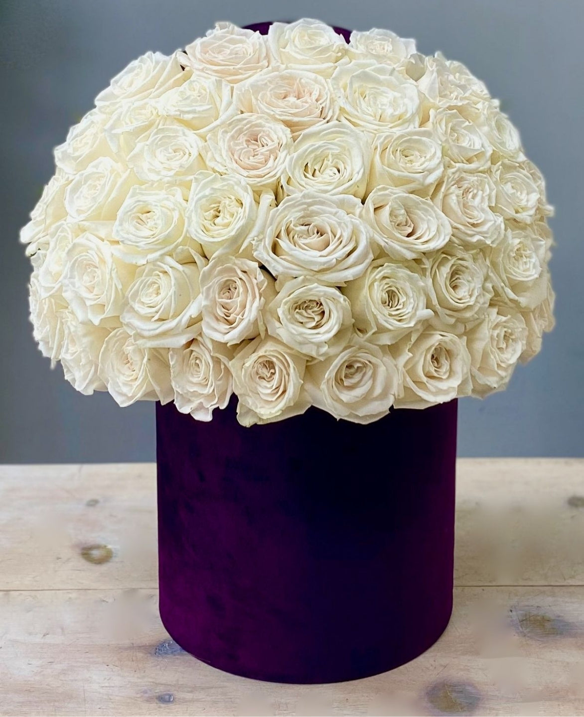 Experience the elegance of 50 to 55 fresh white roses expertly arranged in a stunning round ball design. This sophisticated floral presentation highlights the purity and beauty of each bloom, making it perfect for special occasions or as a refined gift. The compact, symmetrical shape ensures a lasting impression with its classic charm and fresh fragrance.